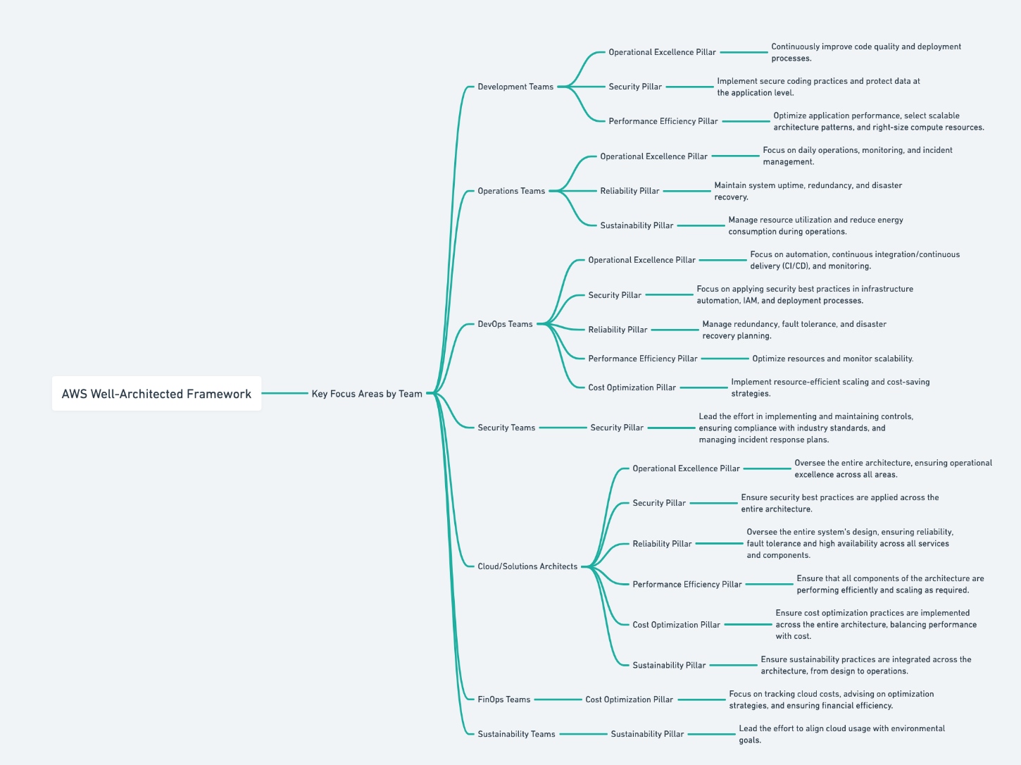 Nota: este rol conecta a todos los equipos. Se aseguran de que los seis pilares del Well-Architected Framework estén presentes en cada decisión técnica y organizativa.